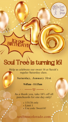 Come join teacher, student and Soul Tree owner, Sarah Woods for a light hearted 90 min Soul Flow Birthday Celebration class!! A special gift back to you...16% off our punch passes (Just for this one day)!!!