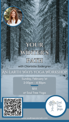 Join us at Soul Tree Yoga to honor your Winter’s Path of rest, reflection, and renewal. Through nature-guided meditation, Earth Ways Yoga, and visioning practices, you will create a blueprint for your winter alignment. This season invites stillness, deep listening, and inner strength. Together, we’ll pause, invite in creativity, and lay a rooted foundation for the season ahead.